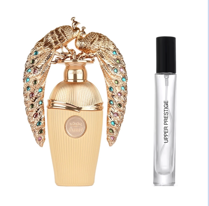 Lattafa Afeef es una fragancia sofisticada y equilibrada que combina frescura luminosa con una feminidad elegante y envolvente. La apertura es brillante y jugosa, donde la bergamota y el durazno aportan una sensación limpia y moderna, matizada por un toque sutilmente especiado de pimienta rosa. En el corazón, las flores blancas —jazmín, flor de azahar y tuberosa— se expresan con elegancia y suavidad, creando un aura refinada y atractiva. El fondo, cálido y cremoso, une sándalo, ámbar, praliné y pachulí para dejar una estela delicadamente dulce, pulida y duradera.